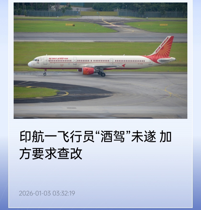该事件源于 2025 年 12 月 23 日,印度航空公司一名飞行员当天执飞一趟从加拿大温哥华飞往印度新德里的航班前,在呼气酒精测试中被检测出处于“受酒精影响”的状态,随后这名飞行员被紧急撤换,由一名替补飞行员执飞(IT之家注:加拿大方面明确规定飞行员在饮酒后 12 小时内不得驾驶飞机)。