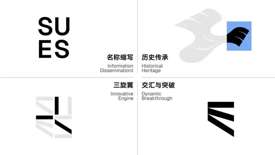 此次升级的新校标基本构成元素为“一”,在中文语境中“一”是“万物”的起点,在西文语境中直线是秩序、精确与力量的象征。新校标由一系列水平和倾斜的“一”线条,通过有机的构成手法排列出学校的英文缩写“SUES”。