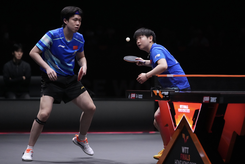 新华社照片,香港,2025年12月13日\n 12月13日,王楚钦/孙颖莎(右)在比赛中。\n 当日,在香港进行的2025年世界乒乓球职业大联盟(WTT)总决赛混双决赛中,中国组合王楚钦/孙颖莎0比3不敌韩国组合林仲勋/申裕斌,获得亚军。\n 新华社发(吕小炜摄)