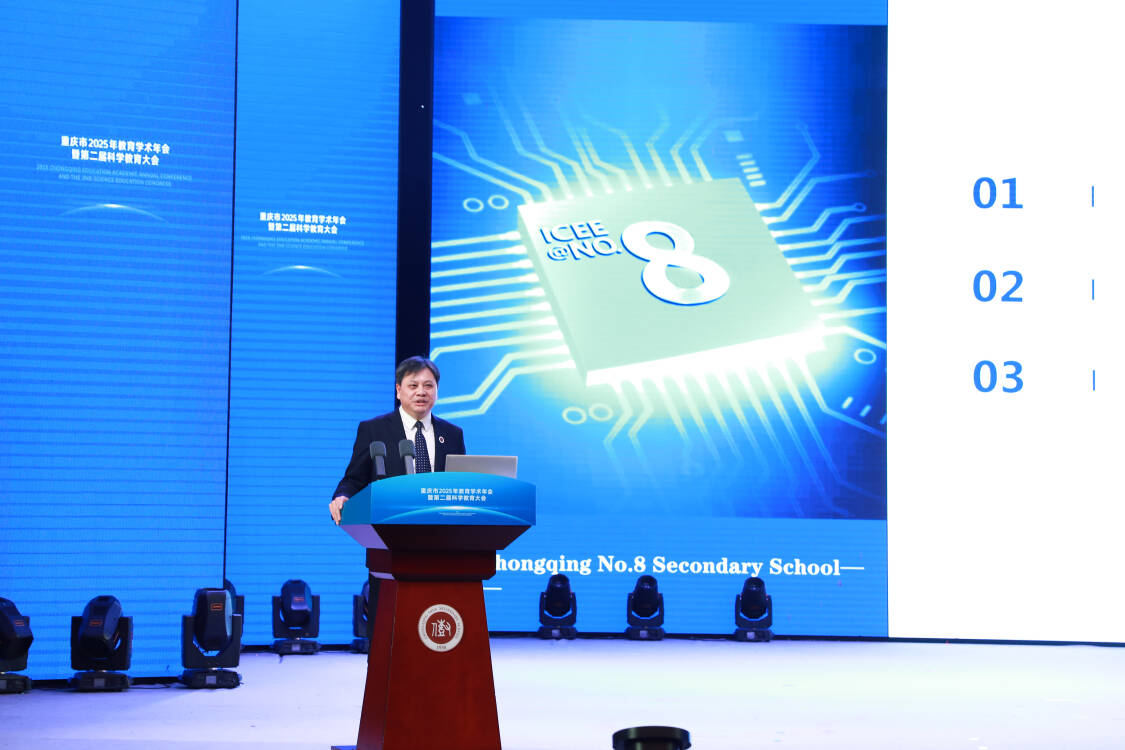 会上,重庆市第八中学校党委书记、教育集团总校长周迎春以《人工智能时代的创新人才培养——重庆八中的创新实践》为题,从新时代学校整体改革构建、创新人才培养之“三创”教育、拔尖创新人才培养的体系跃升三个维度,分享了学校创新人才培养的实践经验。