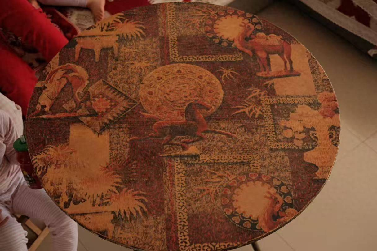 除夕这天,范晓明从仓库里拿出一张骏马图圆桌。这是1985年母亲花重金买下的老桌子,至今已陪伴家人41年。桌面印有骏马与骆驼,充满草原气息,历经岁月依旧完好。