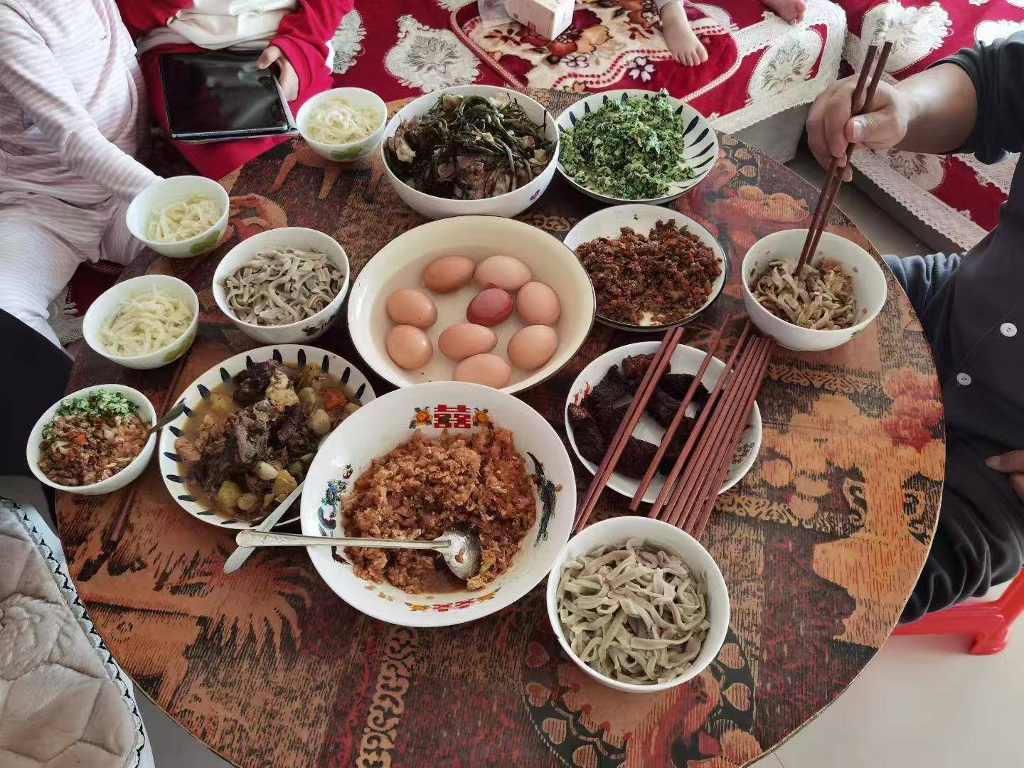 今日除夕夜,在湖南工作的内蒙人范晓明特意从家里仓库里翻出了一张骏马图圆桌,一家人围着围着这张圆桌过除夕夜。范先生将这张圆桌戏称为“老演员”,它已经40多岁,是爸妈结婚时买的,也见证了他从孩童到成家的全过程。今年是马年,他特意将这张桌子搬了出来,寓意“骏马迎新,年年如意”。今年春节假期,内蒙人范晓明一家格外特别——他、土家族妻子覃女士,再加上家中亲戚,三人恰逢本命年。他带着妻子第一次回内蒙古老家过年,跨越千里的团圆,温暖又有纪念意义。